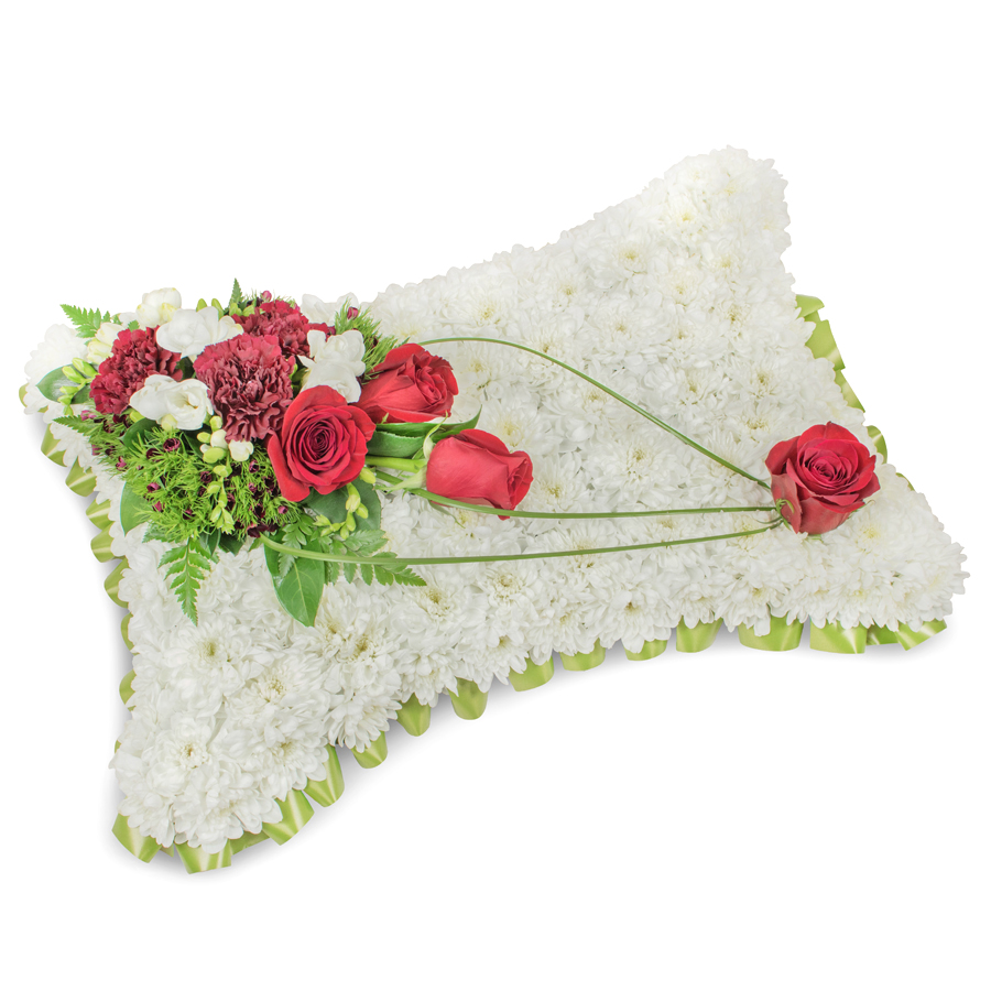 Every cushion is arranged by our expert florists using fresh, high-quality blooms for long-lasting beauty. The classic red and white colour palette symbolises love, purity and remembrance, making this tribute suitable for family, friends and colleagues. Approximate dimensions are 45cm (18") in length, 60cm (24") in width and 12cm (5") in height, creating a substantial yet tasteful display.