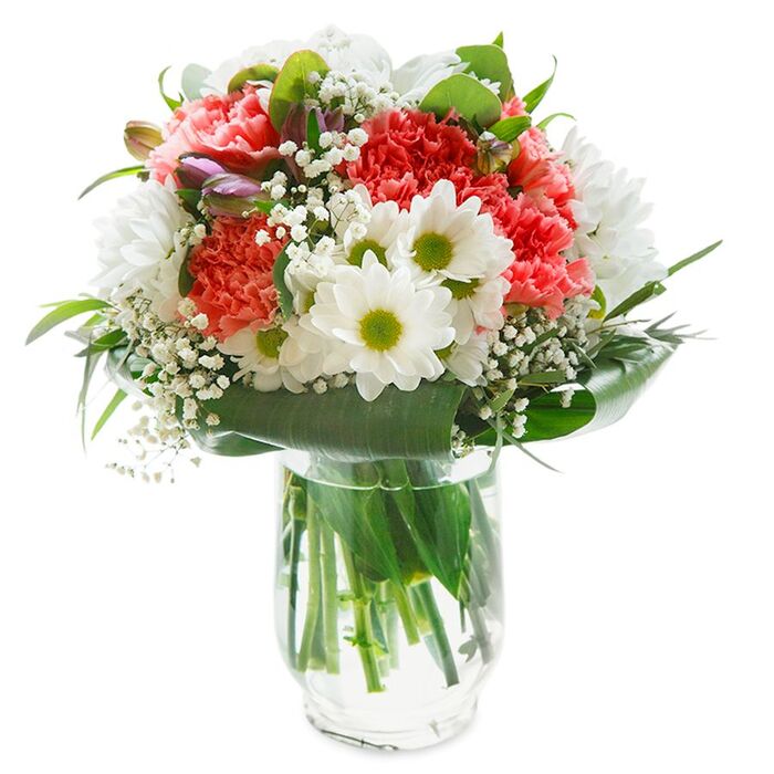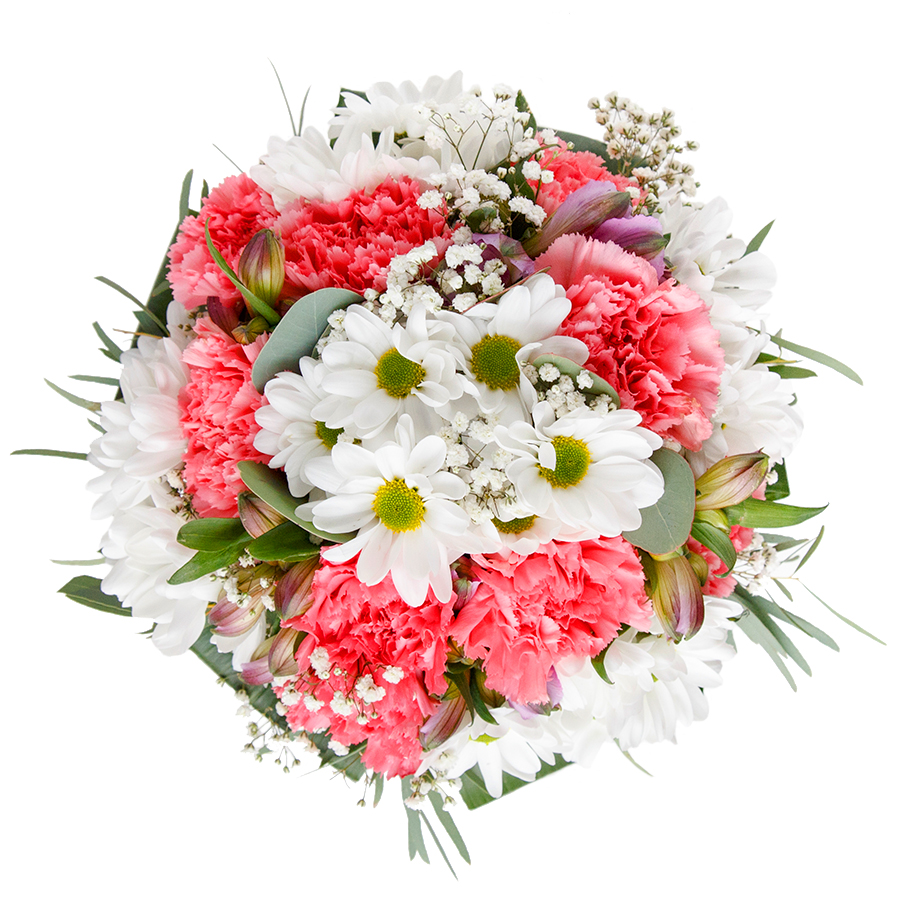 The white chrysanthemums and pink carnations were a perfect combination. Beautifully arranged!